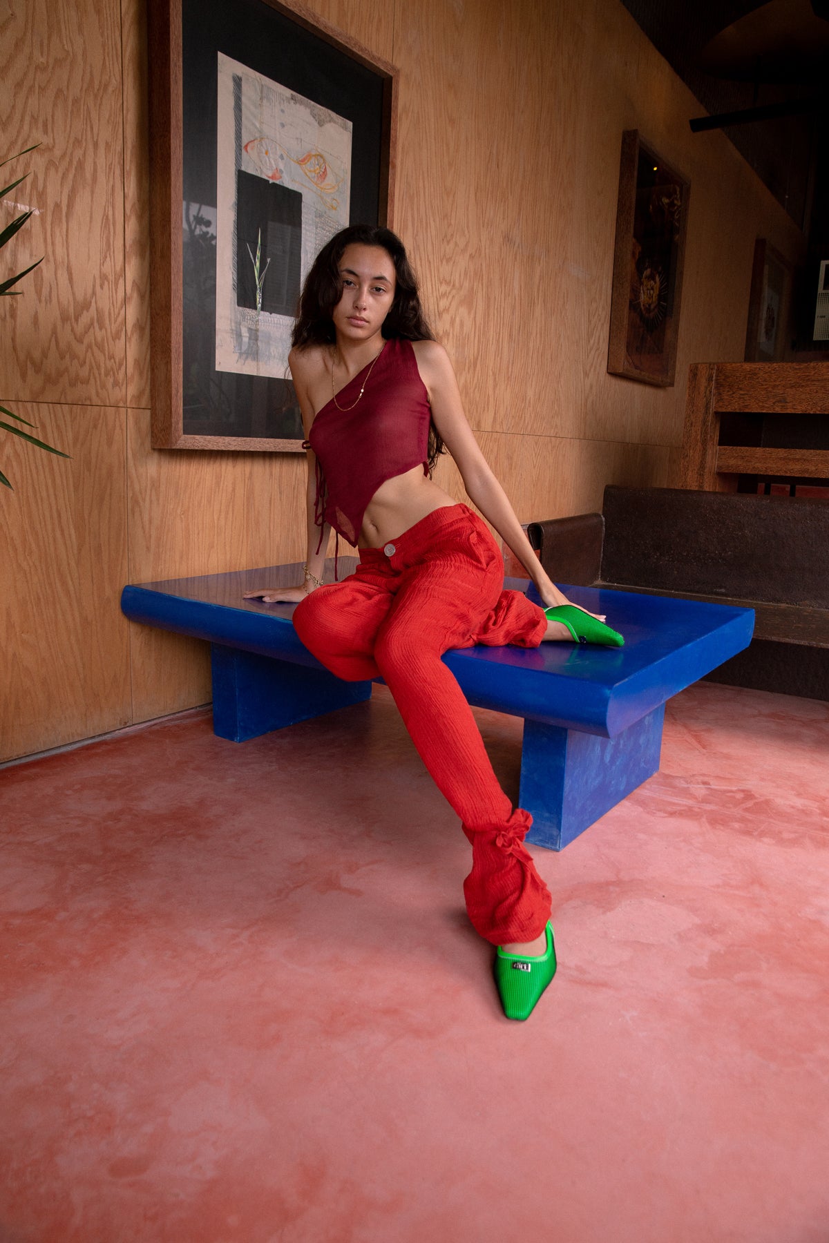 - Styled with the Kiki Plum Silk One Shoulder Top.